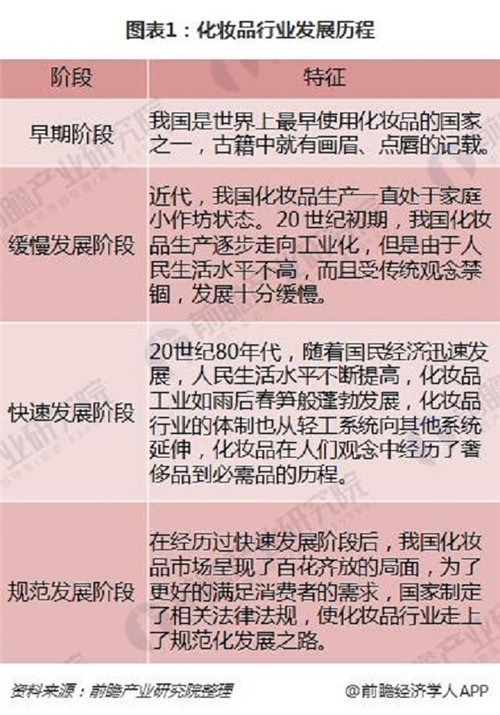 中国化妆品行业的发展有着漫长的历史。大致分为四个阶段:早期阶段、缓慢发展阶段、快速发展阶段及规范发展阶段。