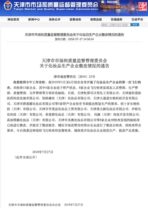 详见7月27日:天津市市场和质量监督管理委员会关于化妆品生产企业整改情况的通告(津市场监管药化〔2018〕23号)