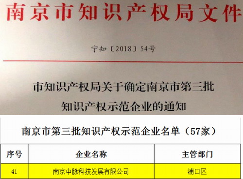 近日,南京市知识产权局发布的第三批知识产权示范企业名单正式公布。中脉于2018年度在南京市知识产权示范企业两年培育期中通过考核验收,被成功认定为第三批“南京市知识产权示范企业”。