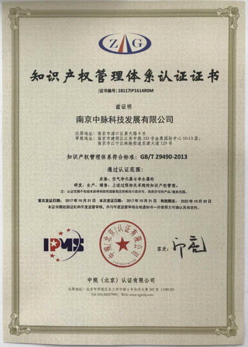 近年来,中脉不断加强知识产权体系建设,通过实施知识产权贯标,构建知识产权管理标准化、规范化体系,准确把握市场机遇,并将知识产权战略融入到企业经营战略中,多次获得“优秀专利新产品”、“优秀发明专利”、“实用专利”等奖项,并于2017年10月获得了“知识产权管理体系认证证书”(认证范围包括:床垫、空气净化器与净水器的研发、生产、销售、上述过程相关采购的知识产权管理),保证了技术创新工作的健康快速发展,增强了公司的核心竞争力。