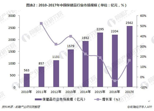 图表2:2010-2017年中国保健品行业市场规模(单位:亿元,%)