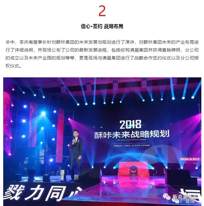 辽宁广誉恒微信公众号“广誉恒集团”8月2日发布的微信中宣称:2018年7月31日,酥咔集团“戮力同心 恒创未来”2018年中表彰盛典暨战略合作签约峰会在沈阳玛丽蒂姆酒店隆重举行。李庆南董事长“现场公布了公司的最新发展进程,包括收购清晨集团并获得直销牌照,分公司的成立以及未来产业园的规划等等,更是现场与清晨集团进行了战略合作签约仪式以及分公司授权仪式。”