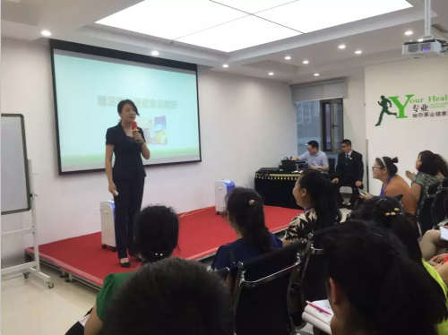 绿活美地培训经理车轩女士向到场市场精英一一介绍了公司几款“拳头”产品——纳之胶囊、怡康胶囊、兰杜粉、十谷丰收的特色及功效。