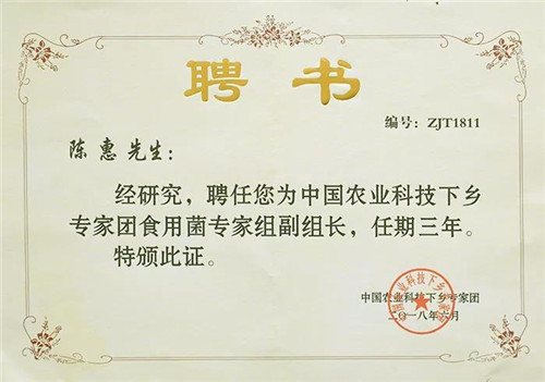 安惠董事长陈惠荣获食用菌专家组副组长证书