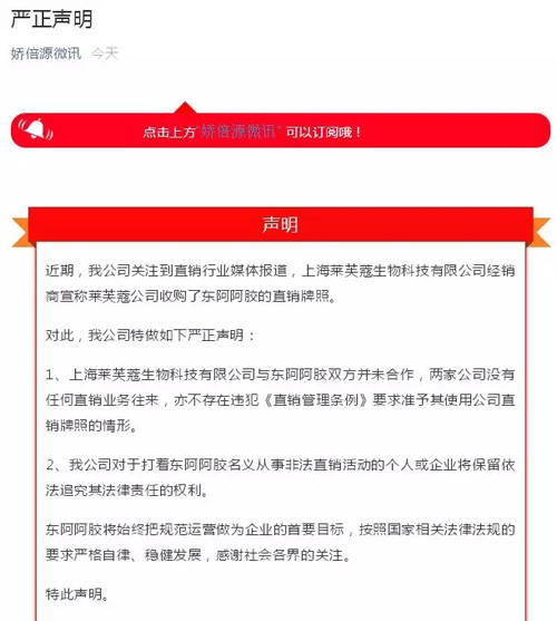 声明称:近期,我公司关注到直销行业媒体报道,上海莱芙蔻生物科技有限公司经销商宣称莱芙蔻公司收购了东阿阿胶的直销牌照。