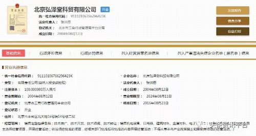 直销头条网编辑在国家企业信用信息公示系统查询到北京弘泽堂成立于2004年08月12日,注册资金100万人民币(实缴资金100万)。法人代表张洪臣,执行董事兼总经理张洪臣,监事章福田,自然股东有张书生、章福田、张洪臣。