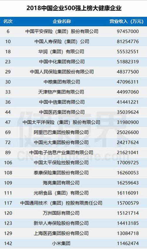 从两年对比看来,药企前三名依然是是国药、上药与广药,除国药排名略有下降1位外,上药与广药分别上升5位和6位。此外,2018年新增大健康企业6家,分别是:小米集团、福中集团有限公司、扬子江药业集团、深圳海王集团股份有限公司、广州轻工工贸集团有限公司、北京粮食集团有限责任公司。