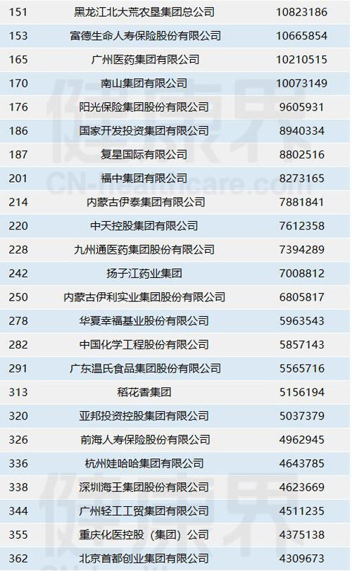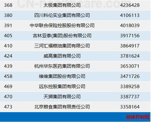 具体从大健康企业(含有大健康版块布局的企业)来看,据健康界统计,共有57家企业上榜。其中,药企前三名分别是国药、上药与广药,且三家药企均已进入中国企业500强千亿“俱乐部”。此外,国药集团以近3504亿元的营业收入位列榜单第44位。具体名单如下: