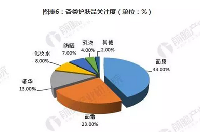 面膜是护肤品中最受关注的子品类。数据显示,面膜目前在各类护肤品中的关注度最高,达43%。