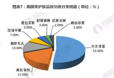 面膜按照功效细分为补水保湿、美白净斑、细致毛孔等八大类。
