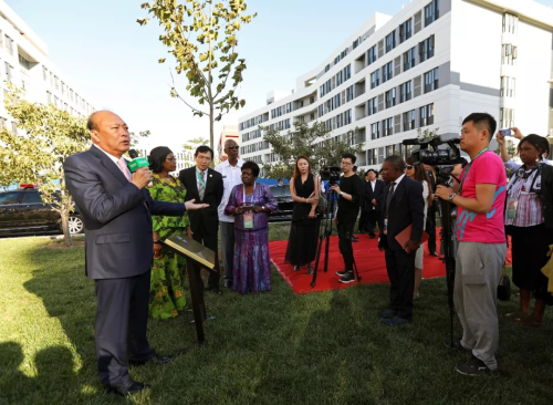 会谈结束后,李金元董事长陪同孔戴夫人一行参观天狮学院。随后,在天狮学院校区内举行了“友谊与和平”纪念碑揭幕仪式,李金元董事长与瓦孔戴夫人共同栽种了一株象征“友谊与和平”的法桐树。纪念碑揭幕仪式过后,孔戴夫人与李金元董事长接受了媒体群访。针对光明日报记者提出的关于天狮集团“一体多翼”战略在几内亚将会有什么具体项目落地的问题,李金元董事长表示天狮集团与非洲国家有着广泛的合作基础,未来将全面覆盖非洲54个国家。李金元董事长指出“一体多翼”战略的落地为重要的是拉动内需,从而真正做到“保就业、保创业、保健康、保发展”。