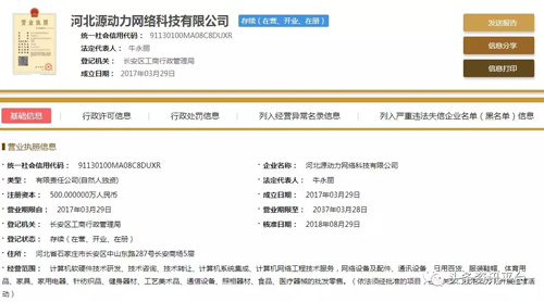 直销头条网编辑在国家企业信用信息公示系统查询到河北源动力成立于2017年03月29日,注册资金500万人民币(实缴资金0元)。法人代表牛永丽,执行董事兼经理牛永丽,监事段彦秋,自然股东牛永丽。