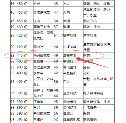 其中,2018年马兴田家族以410亿元的财富,位居国内第52名.