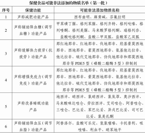根据原国家食品药品监督管理局《保健食品中可能非法添加的物质名单( 第一批) 》(食药监办保化〔2012〕33 号),保健食品可能非法添加的物质名单如下: