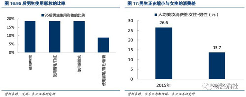 唯品会和艾瑞共同报告显示,2017年95后男性的化妆品销售规模同比增长42.9%,较去年多增26.2pct;近四成的95后男生接受日常化妆,平均每5个95后男生中就有一个使用BB霜。消费水平上,男性正逐渐追上女性的化妆品消费水平。男女生的人均支出差由2015年26.6元缩小到2016年的13.7元。
