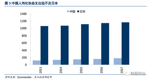 消费水平方面,2017年国内人均支出仅为181元,远不及日本(1196 元)。对标接近饱和的日本市场,国内的化妆品市场有望发展到万亿以上(10177 亿元)的体量,对应的人均支出为760元。