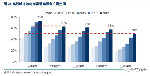 美妆习惯逐步养成,电商渠道下沉激发消费潜力。凯度数据显示,2017 年二线、三线和四五线城市的在护肤彩妆上的人均消费分别同比增 19%、20%和 20%,远超一线城市(9%)。