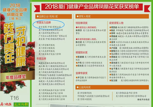 金日制药(中国)从众多优秀参选企业中脱颖而出,荣获“2018厦门健康产业品牌凤凰花奖年度实力品牌企业”称号,再次树立行业标杆!这是市场及消费者对金日的认可,是实至名归的荣誉嘉奖!
