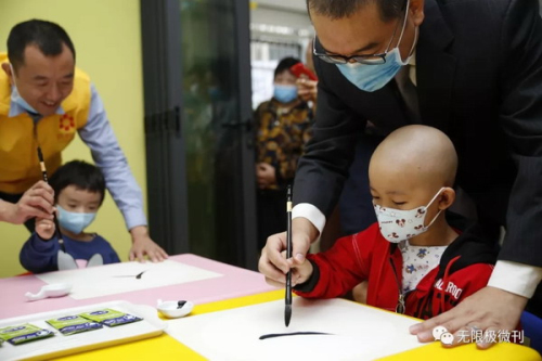 在开学典礼现场,嘉宾们共同为病房学校举行了揭牌仪式。首批入学的白血病儿童代表在嘉宾的陪护下,写下“人”字,完成开笔礼——这一活动意在祝福孩子们在病房学校健康成长、早日康复,顺利融入社会。