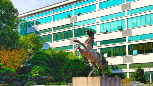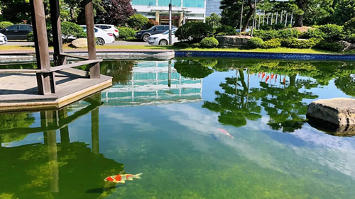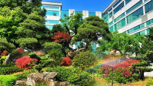 早晨太阳升起的时候,阳光透过“马到成功”的铜塑照在“万物林”,在四季常青的香樟树、罗汉松之间,点点红枫显得特别耀眼。中午在园中漫步,“乾坤湖”旁一组“薪火传承”的铜塑,重现着古代中医选材制药代代相传的精诚至善。而另一处潺潺流水的景观,层叠的奇石和层次丰富的树木,倒影在碧清的水中,“上善若水”,包容大气的美总能引人驻足。傍晚,夕阳斜照在代表“道生一,一生二,二生三”的三棵树下,老子骑着青牛在这里悟道。