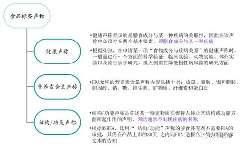 1938年美国国会颁布了《联邦食品、药品和化妆品法(FD&C Act)》,并在上世纪90年代相续出台了《营养标签与教育法(NLEA)》、《膳食补充剂健康与教育法 (DSHEA)》,使得食品标识与健康声称的管理逐渐清楚、细化。根据美国法规,食品的标签声称可分为三类:健康声称、营养素含量声称以及结构/功能声称。