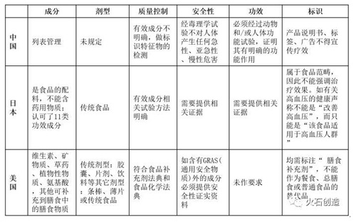 全球保健(功能)食品市场远没有成熟,各国的起步时间不同,中国保健食品与日本“特定用保健食品”、美国“膳食补充剂”在概念和要求上存在较大差异。