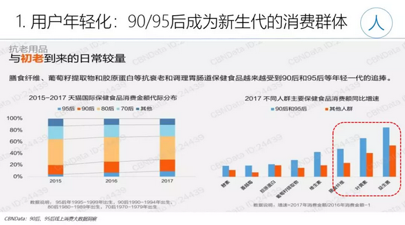 首先,对我们影响最大的是用户的年轻化。过去十几年的行业发展路径主要是围绕50、60、70后中老年人群的消费需求,今天我们绝大部分企业都还在争夺这些存量用户;现在90、95后是保健行业的新消费群体,是增量市场。企业服务好中老年消费群可以拥有现在,而只有赢得90、95后才能拥有未来。中国营养保健食品的市场渗透率是20%,美国大概在50%到60%,其实中国40岁以上的人群服用营养保健产品比例也也在40%左右,真正的差距是在年轻的消费群体。中国营养保健食品行业的最大挑战或者机遇之一就是如何提高市场渗透率,不断增加新的消费群体,而不只是一味地试图影响中老年人买的更多。这还停留在用存量思维来发展品牌业务。这里天猫的数据表明90、95后在保健产品消费方面已经远远超出了其他年龄段的消费贡献,特别是在膳食纤维、叶黄素和益生菌等几个类目,未来他们会成为网络上最重要的购物主力。当然90后消费群体是不容易接触,他们有着非常独特的消费需求和购物习惯。