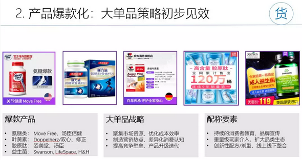 第二个行业的热点词是产品爆款化。所谓产品爆款化,并不是一个新概念,只是在2018年有了更为突出的市场成效。我梳理一下线上几个热门的大单品,首先是氨糖类Move Free是跨境关节护理类的第一名,第二个是汤臣倍健的健力多,今年上半年公司销售收入4.2亿人民币,单品已占公司整体业绩的20%,今年健力多极有可能达到或接近10个亿的营收目标。