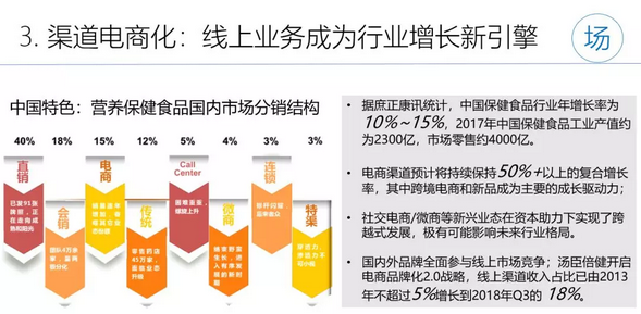 第三个行业关键词是渠道电商化。根据庶正康讯的数据统计,中国保健食品行业市场零售规模约4000亿,其中58%来自直销和会销渠道。而在美国直销渠道仅占整个营养保健市场的16%左右。