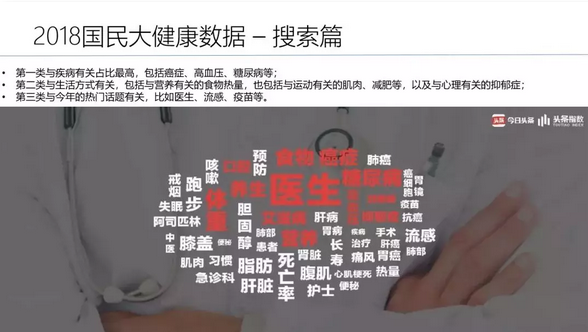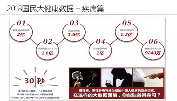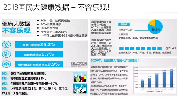 我们的消费者已经开始觉醒,并对自己的健康和疾病管理做研究和预防。这里是今日头条收集了过去一年的大数据并通过算法整合梳理出来消费者最关注健康类别和十大疾病,其中癌症、糖尿病和高血压是关注度最高的,其他的像颈椎病和胃病也是热点,消费者非常渴望对这些疾病有深入的认知和了解,然而互联网上的信息很不规范,鱼龙混杂,很多信息甚至是负面的,这样都会严重影响消费者的健康习惯和健康意识,我们营养保健行业的企业和从业者应该要担当这样的教育责任,积极传播更加科学和理性的健康观念。