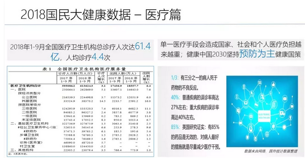 有了疾病大家首先想到的是采取医疗手段,根据统计,每年全国医疗卫生机构人均诊疗6次,也就是说我们每个人平均每年要去医院6次,今年还在增长。单一的医疗手段会造成国家财政负担、社会医疗资源和个人生活负担。而且跟大家分享一个来自葛兰素史克的数据,他们估计90%的药物,只对30%到50%的群体有用。