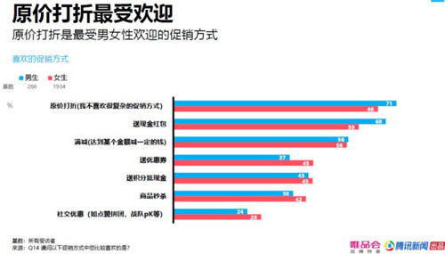 此外,《报告》统计发现,以特卖为代表的原生折扣已经成为最受男女性欢迎的促销方式。其中,一线的男性与女性更加偏爱原价打折,不喜欢很复杂的促销方式。从2016年到2017年,唯品会128大促的人均消费额增长率在一线城市为19.9%,二线城市为16.6%,领先于其他各线级城市。