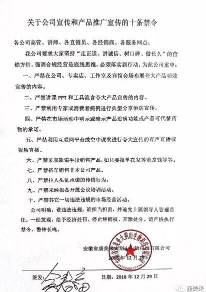 今天余春富董事长亲自签发《关于公司宣传和产品推广宣传的十条禁令》,要求公司全体干部、职工和事业伙伴,敬畏法律,合规经营,牢固树立底线思维,向国家监管政策看齐,自觉接受市场监管部门监管,自觉维护公司信誉和品牌,牢固树立党和国家利益高于一切的理念,对社会负责,对消费者负责。