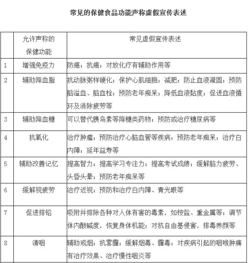 国家市场监管总局官网也曾多次发布提示,明确国内目前批准注册的保健食品允许声称的27类保健功能,并与之相对整理了市场上针对保健食品常见的27类虚假宣传表述。