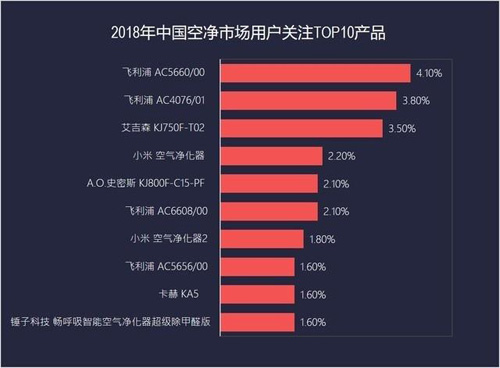 2018年最受关注的空净产品中,前三名里飞利浦占据两席,而在前十名中更是累计有四款产品上榜。