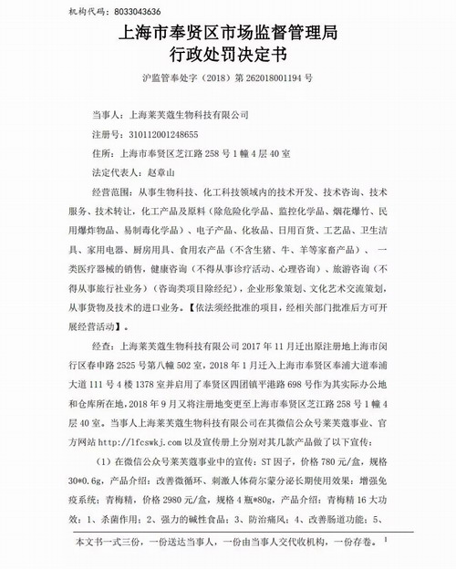 虚假宣传产品 上海莱芙蔻被罚款4.38万元