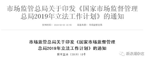 2月3日,国家市场监管总局官网发布了2019年立法工作计划,明确2019年市场监管领域的立法工作。