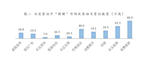 在保健品行业快速增长背后,“保健”市场乱象丛生,诸如虚假宣传、违法广告、非法添加、假冒伪劣、无证和无照经营、价格违法、消费欺诈、传销等乱象引起舆论关注。据搜索,百度大数据显示(数据截止日期为2019年1月14日):同时以“保健”“虚假宣传”为关键词的相关资讯有28.8万篇;同时以“保健”“违法广告”为关键词的相关资讯有34.1万篇;同时以“保健食品”“非法添加”为关键词的相关资讯有7.0万篇;同时以“保健”“假冒伪劣”为关键词的相关资讯有16.5万篇;同时以“保健”“无证经营”“无照经营”为关键词的相关资讯有10.3万篇;同时以“保健”“价格违法”为关键词的相关资讯有48.0万篇;同时以“保健”“ 消费欺诈”为关键词的相关资讯有34.1万篇;同时以“保健”“传销”为关键词的相关资讯有39.9万篇;同时以“保健”“非法直销”为关键词的相关资讯有61.9万篇;同时以“保健”“ 免费旅游”为关键词的相关资讯有88.9万篇。