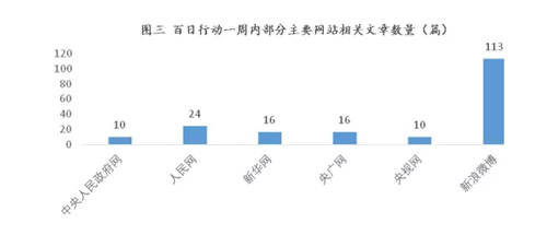 “百日行动”启动一周以来,舆论给予了高度关注。据搜索,百度大数据显示,以“整治保健市场乱象百日行动”为关键词的相关资讯达到5.2万篇。在中央人民政府网中,以“整治保健市场乱象百日行动”为关键词的相关资讯有10篇。在人民网中,以“整治保健市场乱象百日行动”为关键词的相关资讯有24篇。在新华网中,以“整治保健市场乱象百日行动”为关键词的相关资讯有16篇。在央广网中,以“整治保健市场乱象百日行动”为关键词的相关资讯有16篇。在央视网中,以“整治保健市场乱象百日行动”为关键词的相关资讯有10篇。在新浪微博中,以“整治保健市场乱象百日行动”为关键词的相关资讯有113篇。如图三所示。