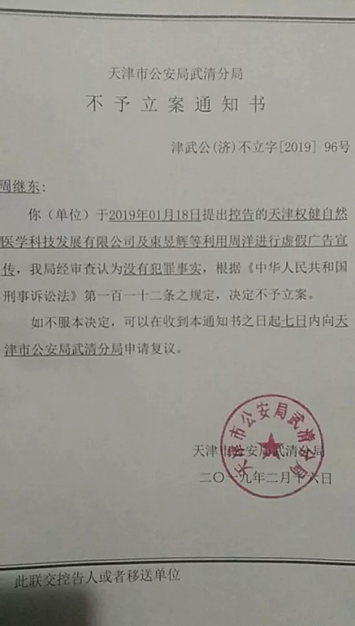 2019年2月16日,天津市公安局武清分局给出了《不予立案通知书》,针对束昱辉非法行医及销售假药和权健公司及束昱辉等利用周洋进行虚假广告宣传,天津市公安局武清分局经审查认为没有犯罪事实,决定不予立案。