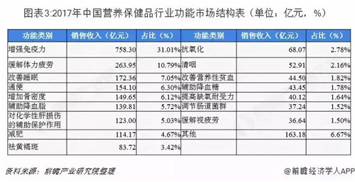 按照营养保健品的功能分类,增强免疫力这种普适类功能性保健品销量最高,2017年销售收入达到758.30亿元,占全部市场比重的31.01%。占全部市场比重超过10%的还有缓解体力疲劳功能的营养保健品,2017年销售收入为26..95亿元,占全部市场比重的10.79%。改善睡眠、通便、增加骨密度、辅助降血脂、解酒护肝等功能的营养保健品也有较大市场,主要与解决常见病或适用于生活中常见场景有关,都占据了全部市场5%以上的份额。其他功能类别的营养保健品市场较小,合计占比不超过30%。