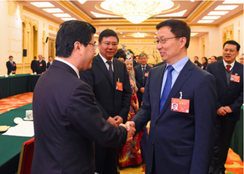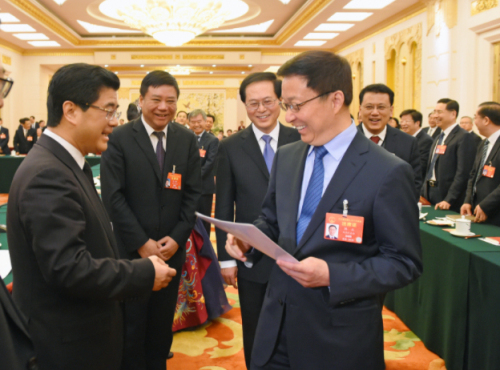 2019年3月7日下午14点50分,中共中央政治局常委、国务院副总理韩正来到浙江代表团参加审议并与代表一一握手交谈。