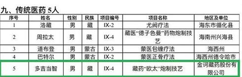 近日,青海省文化和旅游厅发布《关于第四批省级非物质文化遗产代表性项目代表性传承人的通知》(青文旅发[2019]66号),金诃藏药股份有限公司前处理车间主任多吉当智荣获藏药“欧太”炮制技艺代表性传承人殊荣。