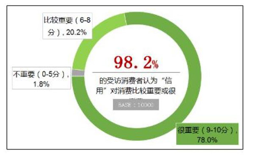 1.受访者普遍认可“信用”在消费中的重要性。调查显示,如果以0~10分来评价“信用”在消费中的重要性,96.1%的受访者给出7分及以上[ ],其中,给出9~10分高分的受访者占比78.0%,说明大多数受访者都认为“信用”在消费中很重要。