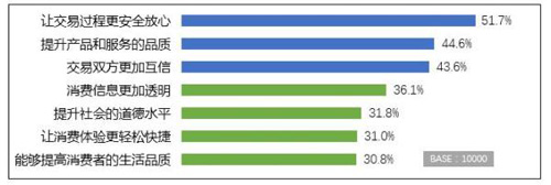 2.信用让消费者更能感知“安全”、“优质”与“互信”。消费者是商品和服务的最终使用者和直接感知者。从受访消费者感知情况看来,“信用”对于放心消费具有多重意义:“信用”意味着交易过程的安全放心(51.7%)、产品和服务品质的提升(44.6%)以及交易双方更加的互信(43.6%);在推动消费信息透明、提升消费体验和消费者生活品质等方面也具有积极意义。