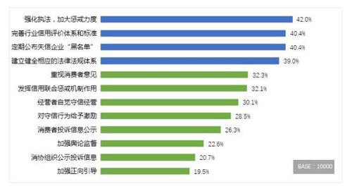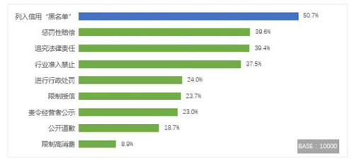 7.超过一半的受访者建议对经营者严重失信行为“列入信用‘黑名单’”予以惩戒。对于发生了严重失信行为的经营者,50.7%的受访者认为“列入信用黑名单”可以有力惩戒经营者严重失信行为。此外,惩罚性赔偿(39.6%)、追究法律责任(39.4%)、乃至行业准入禁止(37.5%),也是得到较多受访者认可的有效措施。