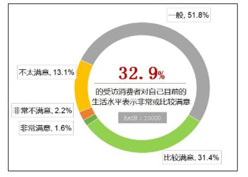 1.受访者对当前生活水平比较满意。对当前生活情况表示满意和非常满意的受访者总体占比32.9%,超过半数受访消费者(51.8%)认为自己目前的生活水平“一般”,只有15.3%的受访者不满意自己目前的生活水平。 综合来看,受访者对于当前的生活水平比较满意。