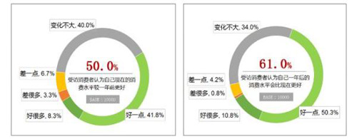 4.受访者预期消费水平总体向好。相比于一年前,50%的受访者认为自己现在的消费水平变得更好了,认为不如过去一年的比例仅有10.0%。在谈到未来一年消费水平时,61.0%的受访者认为会比现在更好。尽管当前经济面临下行压力较大,但消费者信心总体充足,消费水平预期向好,对消费潜力的释放具有积极意义。