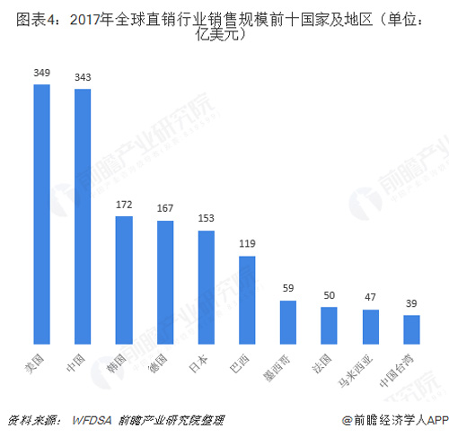 图表4:2017年全球直销行业销售规模前十国家及地区(单位:亿美元)
