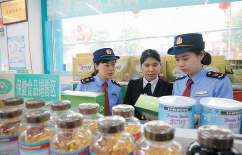 南宁市市场监督管理局执法人员对药店保健食品开展专项检查。 (何正君 摄)